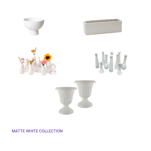 Below you will find the inventory we have in stock to rent with your wedding floral! We carry glass vases, gold terrariums, wood boxes, bud vases, and a variety of other styles for your needs.